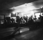 Description :HOMMES JOUANT AUX QUILLES AU SALON DE QUILLES SITUE AU 10A DE LA RUE WELLINGTON SUD. LA PLUPART PORTENT VESTE ET CRAVATE. ATMOSPHERE DE FILM ANCIEN.
