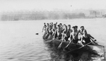 Description :UN GROUPE DE QUINZE HOMMES, TORSE NU, DANS UN CANOT. ILS RAMENT SUR LA RIVIERE MAGOG. A L'ARRIERE-PLAN, LA CANADIAN INGERSOLL-RAND.