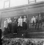 Description :1.1: VUE ELOIGNEE D'UN GROUPE D'HOMMES ET DE FEMMES SUR LE PERRON DE LA RESIDENCE DES BELISLE, SITUEE AU 233 BELVEDERE SUD, A L'INTERSECTION DE MCMANAMY. - 1.2: VUE RAPPROCHEE D'UN GROUPE D'HOMMES ET DE FEMMES, SUR LE PERRON DE LA MAISON DES B...