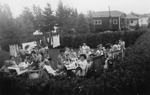 Description :GROUPE D'UNE TRENTAINE DE PERSONNES ( HOMMES, FEMMES ET ENFANTS), SUR UN TERRAIN PRIVE. ELLES SONT TOUTES A TABLE. UNE CORDE A LINGE COUVERTE DE VETEMENTS MIS A SECHER, EN ARRIERE-PLAN.