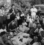 Description :GROUPE D'HOMMES, FEMMES ET ENFANTS A UN PIQUE-NIQUE. A L'ARRIERE-PLAN, UNE AUTOMOBILE.