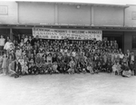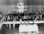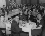 Description :GROUPE D'HOMMES ET FEMMES A UN BANQUET. A L'AVANT-PLAN, SE TROUVE UN LOT DE TROPHEES ET DE PRIX. PAUL-EMILE SEVIGNY EST A L'EXTREME GAUCHE, SUR LE DEUXIEME RANG.