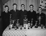 Description :CINQ HOMMES QUI PORTENT L'HABIT ET LA CRAVATE, SONT DERRIERE UNE TABLE DE TROPHEES. DE GAUCHE A DROITE; ? GOULET, ? RASSIS, ?, ? NADEAU, PAUL-EMILE SEVIGNY.