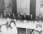 Description :HOMMES ET FEMMES REUNIS A UN BANQUET. LA TABLE D'HONNEUR EST MISE EN EVIDENCE. A L'EXTREME DROITE: JEAN-PAUL PERREAULT, BIJOUTIER-HORLOGER. DRAPEAUX BRITANNIQUE ET AMERICAIN QUI SE CROISENT AU MUR. BOUTEILLES DE BIERE DOW SUR LES TABLES.