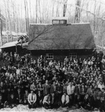 Description :6.1 - UN GROUPE D'ENVIRON 200 HOMMES, FEMMES ET ENFANTS, AU PRINTEMPS, REUNIS DEVANT UNE CABANE A SUCRES SITUEE A SHERBROOKE, AU BOUT DE LA RUE DUNANT, A COTE DE L'ANCIENNE FERME GAGNON. PLUSIEURS ONT DES CASSEROLES A LA MAIN. VUE EN PLONGEE. ...