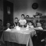 Description :GROUPE D'ENFANTS ASSIS A TABLE LORS D'UNE FETE CHEZ LES SEVIGNY. DE GAUCHE A DROITE: PIERRE SEVIGNY, GUY COTE, JACQUES DOIRON, ANDRE DOIRON, NICOLE ET CLAUDE SEVIGNY.