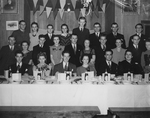 Description :GROUPE D'HOMMES ET FEMMES A UN BANQUET, DANS UN CLUB DE RAQUETTEURS. PAUL-EMILE SEVIGNY EST LE SEPTIEME AU DEUXIEME RANG. DE GAUCHE A DROITE, LE DEUXIEME DU PREMIER RANG: "DOC" DUPUIS, REPRESENTANT MOLSON.