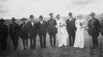 Description :DES MILITAIRES, DES HOMMES EN HABIT, UNE MARIEE ET UNE DEMOISELLE D'HONNEUR SONT DISPOSES SUR UNE LIGNE DANS UN CHAMP.