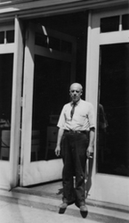 Description :EUGENE SEVIGNY DEVANT LE MAGASIN LEVESQUE LIMITEE, UNE CIGARETTE A LA MAIN.