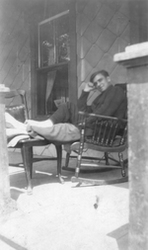 Description :JEUNE HOMME ASSIS SUR UNE CHAISE BERCANTE SUR LE PERRON D'UNE MAISON, IL REPOSE SES PIEDS SUR UNE AUTRE CHAISE, A LA RESIDENCE PATERNELLE DU 218 BOULEVARD ALEXANDRE (AUJOURD'HUI LE 1020).