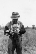Description :PAUL-EMILE SEVIGNY PORTANT UN CHAPEAU, FUME LA PIPE, UN APPAREIL-PHOTO FOTH-FLEX A LA MAIN.