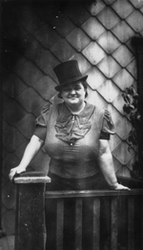 Description :FEMME EN JUPE, CHEMISE A JABOT ET CHAPEAU HAUT-DE-FORME SUR LE PERRON DE LA RESIDENCE DE EUGENE SEVIGNY.