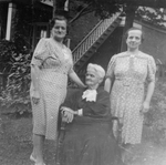 Description :TROIS FEMMES SONT DANS LE JARDIN DES DESRUISSEAUX, DU 190 BOULEVARD ALEXANDRE (AUJOURD'HUI 198). DE GAUCHE A DROITE: FLORA LABADIE (MERE DE PAUL-EMILE SEVIGNY), HENRIETTE PETITCLERC, ASSISE, ET EVA LABADIE.