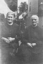Description :DEUX DAMES AGEES ASSISES SUR DES CHAISES. A L'ARRIERE-PLAN, DES IMMEUBLES A LOGEMENTS MULTIPLES.