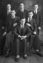 Description :SIX HOMMES EN HABIT ET CRAVATE, DONT TROIS SONT ASSIS. PREMIER RANG: GASTON SEVIGNY. AU DEUXIEME RANG: ROBERT ET PAUL-EMILE SEVIGNY. AU TROISIEME RANG: LES TROIS FRERES DESRUISSEAUX.
