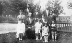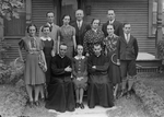 Description :FAMILLE DE DOUZE PERSONNES, DONT DEUX ECCLESIASTIQUES, DEVANT LA FACADE DE LA MAISON DES DESRUISSEAUX. PREMIER RANG: DARTOIS, HELENE ET LEONCE DESRUISSEAUX. AU DEUXIEME RANG: BEATRICE, ?, ? ET FRANCOIS DESRUISSEAUX. TROISIEME RANG: ISABELLE DE...