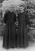 Description :DARTOIS ET LEONCE DESRUISSEAUX, EN SOUTANE, DEVANT L'EGLISE IMMACULEE-CONCEPTION.
