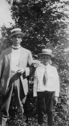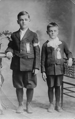 Description :PHOTO DE STUDIO AVEC DECOR EN TROMPE-L'OEIL. LES DEUX ENFANTS SONT EN CULOTTES COURTES ET PORTENT UN RUBAN DU COTE GAUGHE DE LEUR POITRINE. PAUL-EMILE SEVIGNY PORTE AUSSI UN BRASSARD AU BRAS GAUCHE. IL A ENVIRON DIX ANS, TANDIS QUE SON FRERE A...