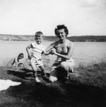 Description :FEMME ET PETIT GARCON DEVANT UN LAC. EN ARRIERE-PLAN, UN PETIT GARCON JOUE DANS L'EAU AVEC UN BALLON.