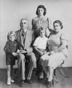 Description :GEORGES ET GERMAINE SEVIGNY ET LEURS TROIS ENFANTS. DE GAUCHE A DROITE: JACQUES, GISELE ET JEAN SEVIGNY. LA CHAISE SUR LAQUELLE EST ASSISE GERMAINE SEVIGNY EST EN FIL DE FER TORSADE.