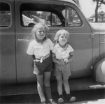 Description :JEAN ET JACQUES SEVIGNY SONT DEVANT L'AUTOMOBILE DE EUGENE SEVIGNY. A TRAVERS LA FENETRE DE LA VOITURE, ON ENTREVOIT L'EGLISE IMMACULEE-CONCEPTION.