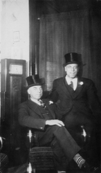 Description :GEORGES ET EUGENE SEVIGNY PORTENT UN COMPLET TROIS PIECES ET UN CHAPEAU HAUT-DE-FORME. LE PREMIER EST ASSIS, L'AUTRE DEBOUT.