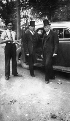 Description :GEORGES ET EUGENE SEVIGNY PORTENT UN COMPLET TROIS PIECES ET UN CHAPEAU HAUT-DE-FORME, ILS SE PREPARENT A ENTRER DANS UNE AUTOMOBILE. ROLAND SEVIGNY, EN CHAPEAU MELON ET BRETELLES, LEUR TIENT LA PORTIERE.