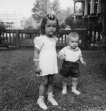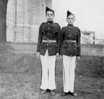 Description :GUSTAVE SEVIGNY, A DROITE, ET UN COLLEGUE CADET, DEVANT UNE BATISSE DE BRIQUE. GUSTAVE SEVIGNY EST DANS LA FANFARE DES CADETS, DE L'ECOLE LAROCQUE.