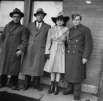 Description :19.1:DE GAUCHE A DROITE: PAUL-EMILE ET EUGENE SEVIGNY, LAURETTE ROBIDAS (ELLE PORTE UN CHAPEAU) ET GILLES SEVIGNY EN HABIT MILITAIRE, SONT DEVANT UNE BATISSE EN BRIQUE. - 19.2 : EUGENE ET GILLES SEVIGNY SONT DEVANT UNE BATISSE EN BRIQUE.