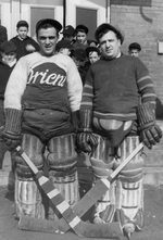 Description :DEUX GARDIENS DE BUT DE L'EQUIPE DE HOCKEY ORIENT, DE LA CANADIAN SILK, DEVANT UNE BATISSE EN BRIQUE.