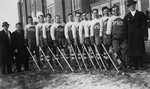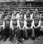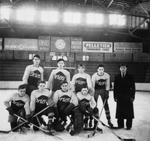 Description :EQUIPE DE HOCKEY ET SES ENTRAINEURS, DEVANT L'ARENA DE L'EXPOS.