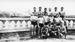 Description :GROUPE D'HOMMES EN MAILLOT DE BAIN, DEVANT UNE BALUSTRADE ET UN COURS D'EAU.