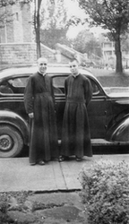 Description :DEUX RELIGIEUSES DANS UN PARC. BEATRICE DESRUISSEAUX EST A DROITE.