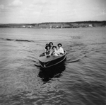 Description :CINQ FEMMES DANS UN BATEAU A MOTEUR, EN MARCHE, SUR UN LAC. C'EST MARGUERITE SEVIGNYQUI CONDUIT.