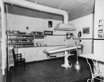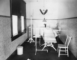 Description :VUE DE PROFIL D'UNE SALLE D'EMBAUMEMENT. UNE CIVIERE D'EMBAUMEMENT SOUILLEE EST SURMONTEE D'UNE LAMPE SUR PIED, A HAUTE PUISSANCE, ET D'UNE BOUCHE D'AERATION RECTANGULAIRE QUI SE CONTINUE PAR UN TUYAU. ACCROCHEE A LA CIVIERE, UNE BOUTEILLE DE ...
