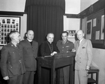 Description :NNGF597: JOHN S. BOURQUE PHOTOGRAPHIE AVEC DEUX OFFICIERS, UN PRETRE ET L'AUMONIER DU REGIMENT. - NNGF598: LES MEMBRES DES FUSILIERS PLACES SUR TROIS RANGEES DERRIERE LA TABLE D'HONNEUR. LE SIXIEME DE LA PREMIERE RANGEE ASSISE EST JOHN S. BOUR...