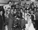 Sujet principal :MEMBRES DE L'EQUIPE DE HOCKEY LE "SAINT-FRANCOIS" DE SHERBROOKE PHOTOGRAPHIES DANS LEUR VESTIAIRE