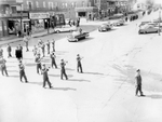 Description :5.1: FANFARE ET VUE DU CORTEGE FUNERAIRE, RUE KING OUEST. A L'ARRIERE-PLAN, LE COMMERCE CANADA PAINT ET LA PHARMACIE THIBAULT. - 5.2: FANFARE DEVANT LE CORTEGE FUNERAIRE, RUE KING OUEST. UNE VOITURE DE POLICE TOURNE SUR LA RUE PEEL. L'AFFICHE ...