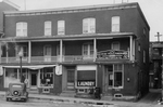 Description :LE BUREAU CHEF EST SITUE DANS UN IMMEUBLE EN BRIQUE DE TROIS ETAGES. LES COMMERCES QU'IL CONTIENT SONT, DE GAUCHE A DROITE; LE COMMERCE DE VETEMENTS GEO KANDALAFT AND CO., UNE BUANDERIE, LA COMPAGNIE DES FRAIS FUNERAIRES DES CANTONS DE L'EST E...