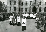 Description :7.1: HECTOR-NAPOLEON BRIEN AVEC CHAPEAU HAUT-DE-FORME NOIR EN CASTOR, ET QUEUE-DE-PIE, EST SUIVI DES PRETRES PORTEURS D'HONNEUR, DONT LE PREMIER DE LA FILE PORTE UN CRUCIFIX, A LA SORTIE DE L'ARCHEVECHE DE SHERBROOKE, QUE L'ON VOIT TRES BIEN. ...