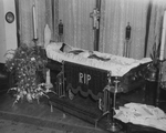 Description :MONSEIGNEUR CHASSE, ANCIEN CURE DE SAINTE-JEANNE-D'ARC, EXPOSE AU SALON MORTUAIRE DE LA RUE SHORT. A L'AVANT-PLAN, L'INSCRIPTION: "RIP", EST BRODE EN LETTRES PALES, SUR DU TISSU FONCE EN RATINE DE VELOURS. A CHAQUE BOUT DU CERCUEIL, IL Y A UNE...