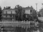 Description :VUE EXTERIEURE D'UN SALON FUNERAIRE DE TROIS ETAGES, EN BOIS. SUR LE HAUT DE L'EDIFICE, A GAUCHE EST INSCRIT: "LA CIE DE FRAIS FUNERAIRES TEL.700". EN AVANT-PLAN, DES ARBRES FEUILLUS, UNE CLOTURE BLANCHE ET UN PLAN D'EAU.