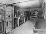Description :INTERIEUR DESERT DU BUREAU DE POSTE, DE FORME RECTANGULAIRE, AVEC COMPTOIRS POSTAUX DU COTE GAUCHE, ET UNE PORTE AVEC LA MENTION: " BUREAU DU GERANT". AU BOUT COMPLETEMENT: UN POELE A BOIS. A DROITE, DEUX BANCS EN CUIR.