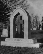 Description :RICHE MONUMENT FUNERAIRE GRAVE H.-N. BRIEN, AU CIMETIERE ST-MICHEL. EN ARRIERE-PLAN, DES ARBRES SANS FEUILLES ET DES PIERRES TOMBALES.