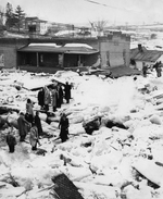 Description :VUE AERIENNE D'UN PAYSAGE HIVERNAL, ON REMARQUE DE LA NEIGE, DE LA GLACE, DES HOMMES EN CHAPEAUX ET DES FEMMES QUI MARCHENT SUR LA GLACE ET CONSTATENT LES DEGATS CAUSES PAR L'EMBACLE . EN ARRIERE-PLAN, UNE BATISSE EN BRIQUE, UN PETIT GROUPE DE...
