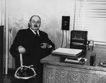 Description :HECTOR-NAPOLEON BRIEN, UN LIVRE DE COMPTES OUVERT DEVANT LUI, ASSIS DE BIAIS A SON BUREAU DU 139 RUE KING OUEST. EN AVANT-PLAN, UN CENDRIER ET EN ARRIERE-PLAN UN TELEPHONE MURAL ET UNE FENETRE AVEC STORES VERTICAUX.