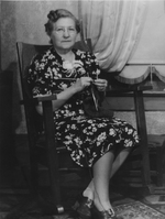 Description :AU SALON, MARIE-MATHILDE OUELLET, ASSISE SUR UNE CHAISE BERCANTE UN TRICOT A LA MAIN. VETUE D'UNE ROBE A FLEURS, ELLE PORTE DES LUNETTES.