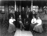 Description :FAMILLE DE SIX HOMMES ET DE QUATRE FEMMES, ASSIS DEHORS, DEVANT LA RESIDENCE FAMILIALE, PROBABLEMENT SITUEE A DANVILLE. PREMIER RANG, DE GAUCHE A DROITE: YVONNE, FRANCOIS-ALEXANDRE, AZELINE, MARIE-ANNE, ROSE-ALBA. DEUXIEME RANG, DE GAUCHE A DR...