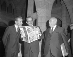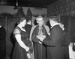 Description :GROS PLAN DE MAURICE DUPLESSIS, MONSEIGNEUR PAUL-EMILE LEGER ET DORIMENE BOURQUE EN TRAIN DE DISCUTER. EN ARRIERE-PLAN, D'AUTRES PERSONNES.