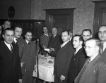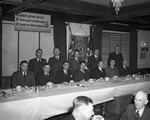 Description :GROUPE D'HOMMES REUNIS SUR DEUX RANGEE DERRIERE UNE TABLE. PREMIERE RANGEE, ASSISE: HARRY WALKER, GERANT DE BELL A SHERBROOKE, L.-W. DIXON, ANCIEN PRESIDENT DE LA CHAMBRE DE COMMERCE, A.-J. WHELON, GERANT DU SERVICE DES VENTES DE BELL, PHILIPP...